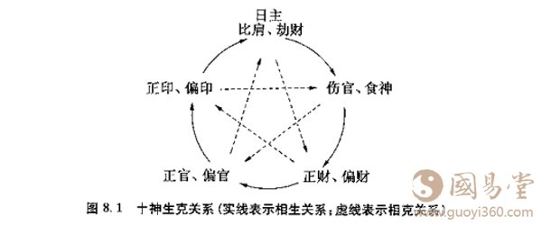 十神相生关系:正财、偏财生正官.偏宫;正官、偏宫生正印、偏印;正印、偏印生比肩、劫财;比肩、劫财生伤官、食神;伤官、食神生正财、偏财。